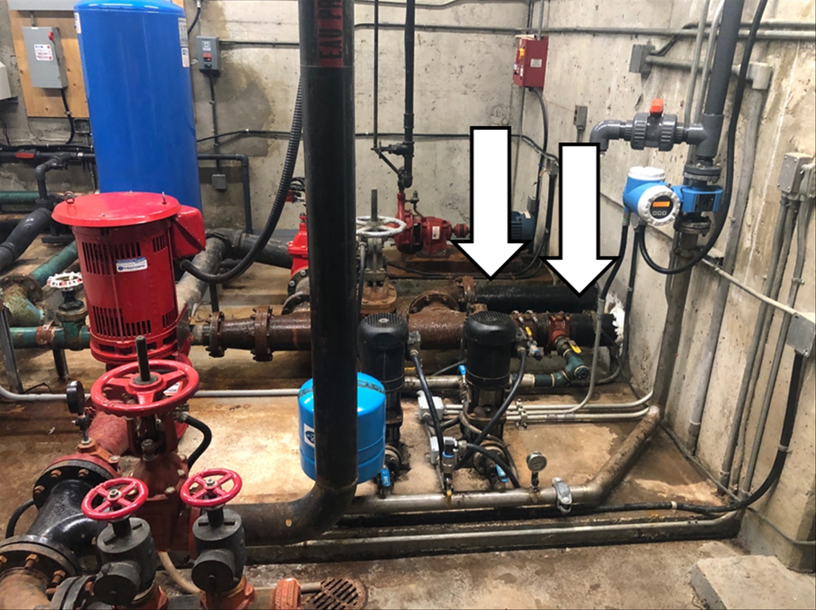 Above, mechanical room below grade where 2 x 150mm drinking water pipes enter.